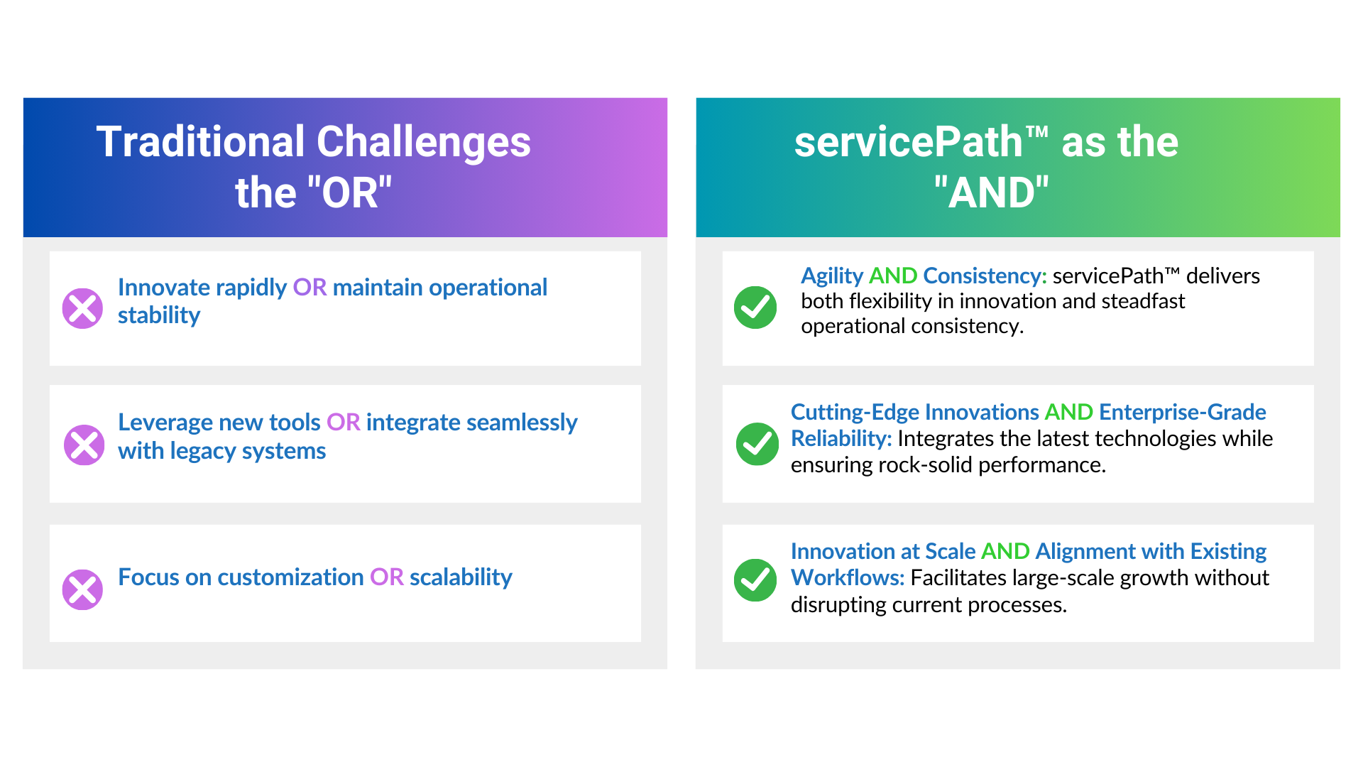 When businesses are trapped in the Tyranny of OR, they face difficult choices—sacrificing one critical objective to achieve another. This outdated mindset forces compromises that limit potential and stifle innovation. servicePath™ challenges this paradigm by introducing the Power of AND, empowering organizations to excel in seemingly conflicting priorities.