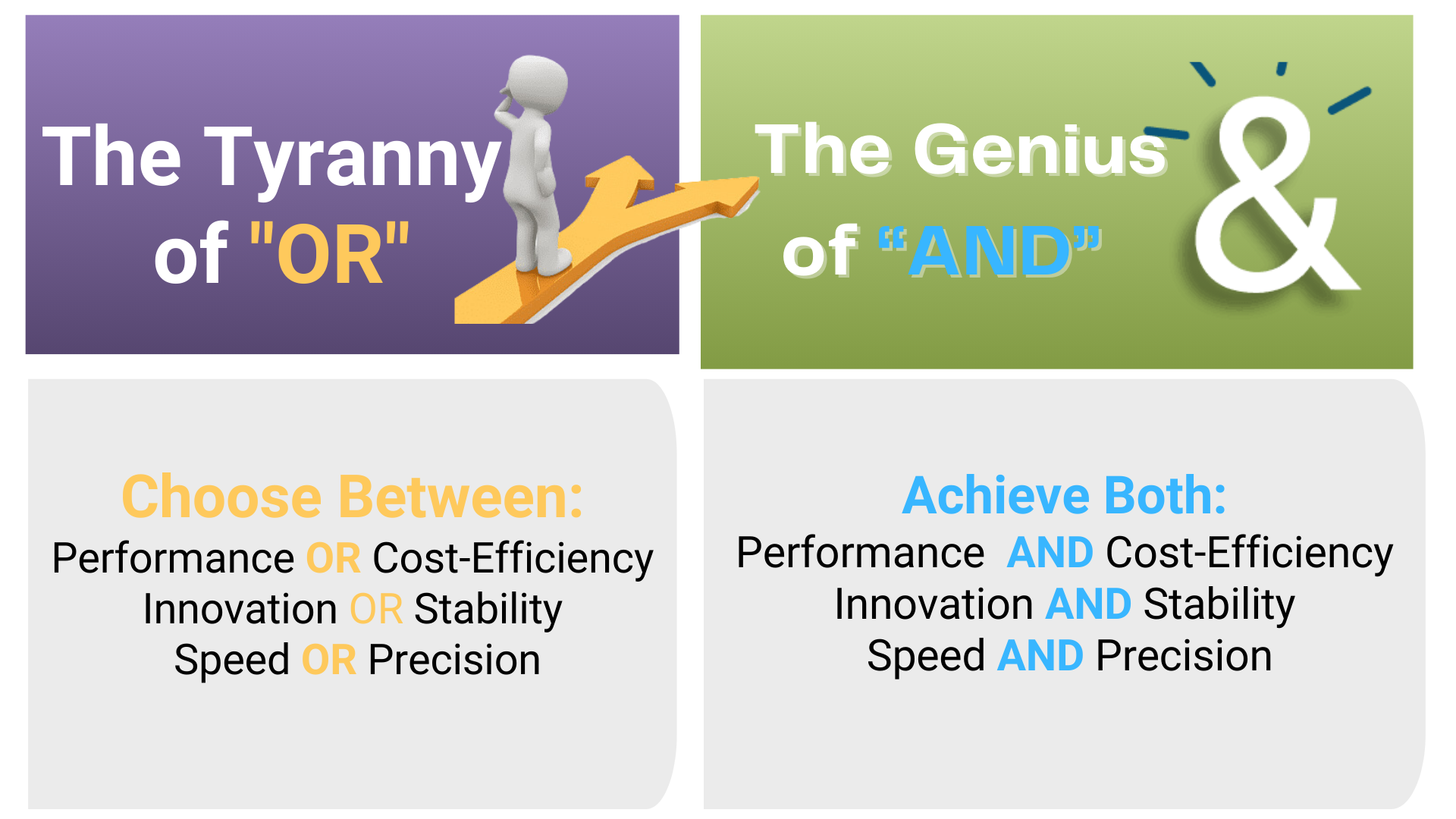 Is your organization struggling to balance conflicting priorities like innovation and stability or speed and accuracy? The Tyranny of OR forces businesses to make compromises that stifle growth and efficiency. Instead of asking what must be sacrificed, it’s time to explore how both objectives can coexist harmoniously with the Genius of AND.
