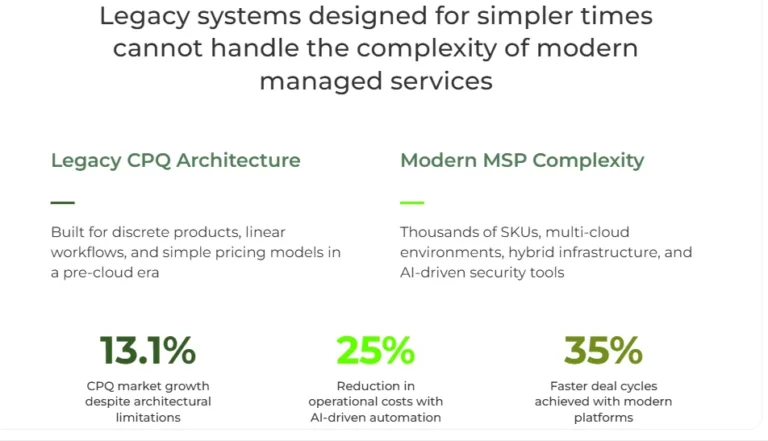 The problem runs deeper than most MSP executives realize. Traditional configure-price-quote (CPQ) systems were architected for simpler times—when businesses sold discrete products through linear sales channels. Today’s MSPs juggle thousands of SKUs across multi-cloud environments, navigate hybrid infrastructure deployments, and must bundle everything from AI-powered security tools to compliance consulting services.