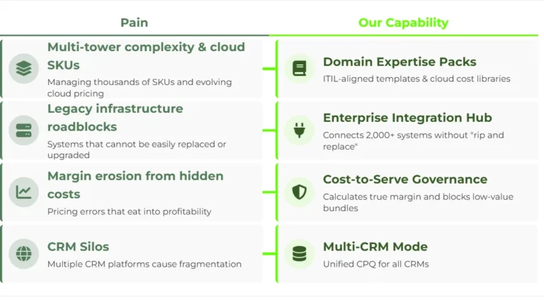 Legacy CPQ tools were built for single-product catalogs and linear approval flows. They melt when confronted with multi-tower managed-service deals that span cloud, network, security, and workplace. Worse, they ignore your biggest operational reality: inherited client infrastructure that must be extended, not replaced.