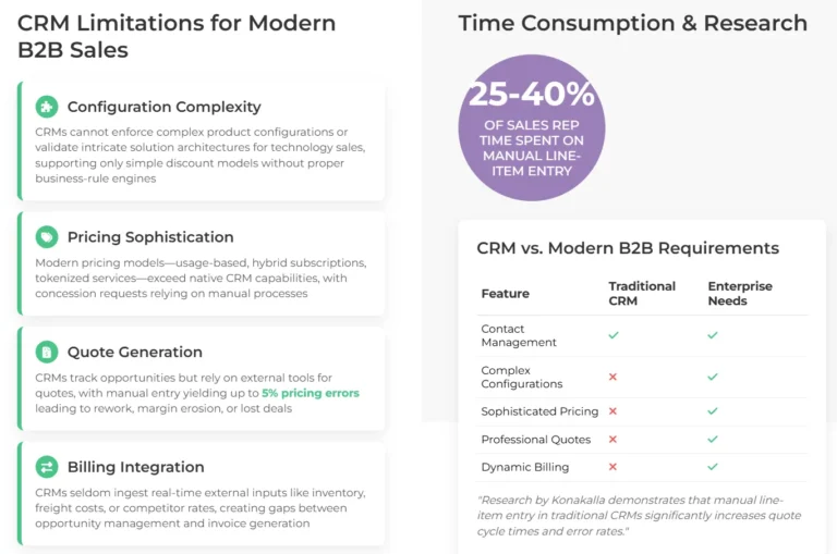 While CRM platforms like Salesforce, HubSpot, and Microsoft Dynamics 365 excel at centralizing contacts, opportunities, and customer interactions, they face significant limitations when it comes to the complex realities of modern B2B sales. Research by Konakalla demonstrates that manual line-item entry in traditional CRMs can consume 25-40% of a sales representative’s time, significantly increasing quote cycle times and error rates.