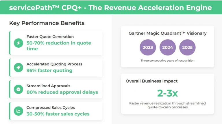 Configure-Price-Quote (CPQ) platforms address the critical gap between opportunity identification and revenue realization. Modern CPQ solutions like servicePath™ transform the quote-to-cash process through several key mechanisms, with organizations reporting measurable improvements across multiple dimensions.