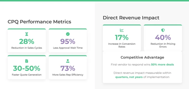 The most compelling argument for prioritizing CPQ investments lies in the quantifiable performance improvements these solutions deliver. Current market research demonstrates that CPQ software reduces sales cycle lengths by an average of 28% and time spent waiting on approvals by up to 95%.