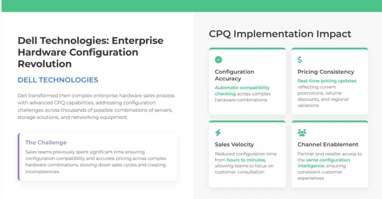Dell’s implementation of advanced CPQ capabilities has transformed their complex enterprise hardware sales process. With thousands of possible configurations across servers, storage solutions, and networking equipment, Dell’s sales teams previously spent significant time ensuring configuration compatibility and accurate pricing.