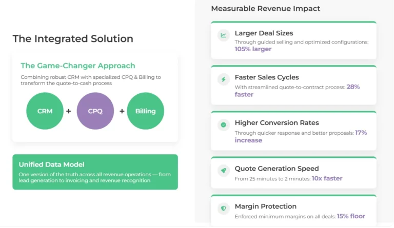 - Combined Impact: When properly integrated, these systems create a unified revenue engine that captures relationship intelligence from CRM and converts it into accelerated revenue through CPQ automation.
