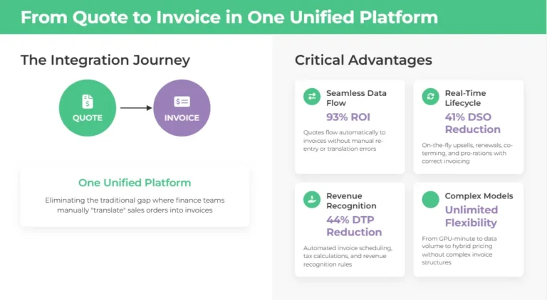 The integration of billing capabilities directly with CPQ systems eliminates the traditional gap where finance teams manually “translate” sales orders into invoices. This integration delivers several critical advantages that address the revenue leakage challenges plaguing many organizations.