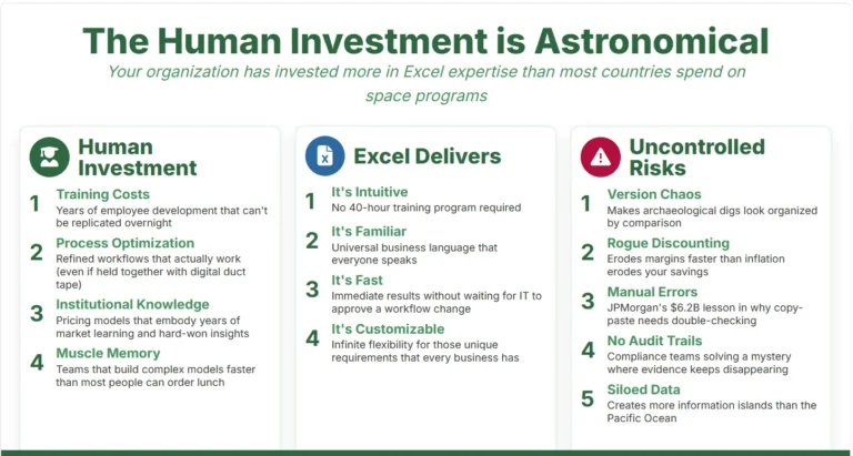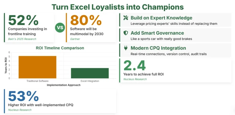 The Bottom Line: Your pricing experts aren’t the problem—they’re the solution. By embracing Excel while adding governance, audit trails, and real-time integrations, organizations can achieve digital transformation success without the transformation trauma that usually accompanies enterprise software implementations.