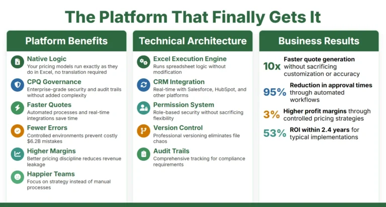 Deliver faster, error-free quotes: Eliminate the manual transcription errors that happen when tired humans try to copy complex pricing data between systems, while maintaining the customization capabilities that make Excel indispensable. Nucleus Research found that well-implemented CPQ solutions deliver 53% ROI within 2.4 years—that’s better than most investment portfolios.