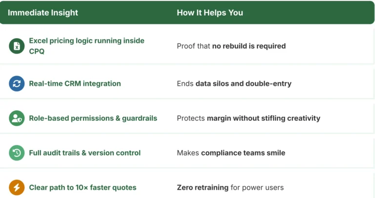 - Live Integration: See your actual Excel pricing logic running seamlessly within an enterprise CPQ environment.