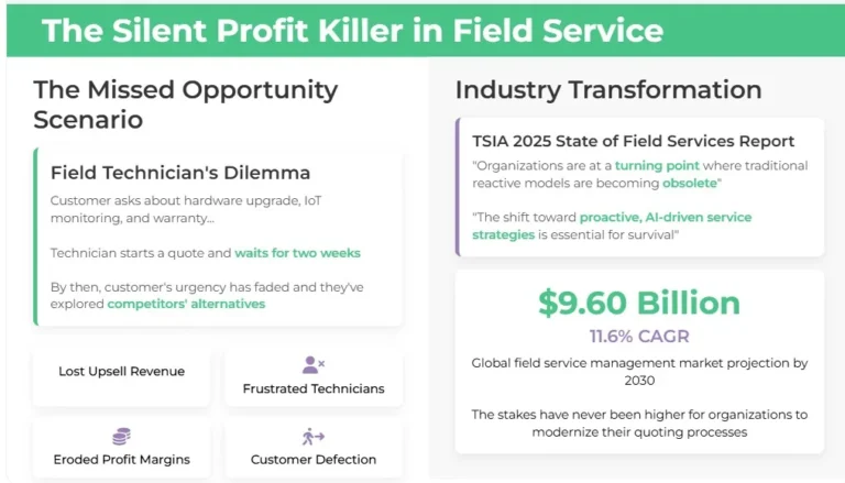 The result is a cascade of missed opportunities: lost upsell revenue, frustrated technicians, eroded profit margins, and customers who turn to more agile competitors. With the global field service management market projected to reach $9.60 billion by 2030 at a CAGR of 11.6%, the stakes have never been higher for organizations to modernize their quoting processes.