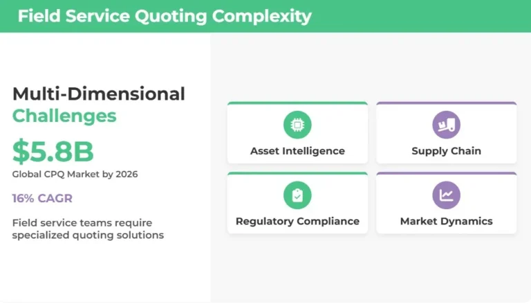 Field service teams don’t sell simple products off a shelf. They deliver intricate, multi-component service packages across vast territories, often under challenging environmental conditions. MGI Research projects that the global market for cloud-based CPQ tools among publicly traded companies will reach nearly $5.8 billion by 2026, growing at a remarkable 16% CAGR, largely driven by the complexity challenges that traditional quoting systems cannot handle.