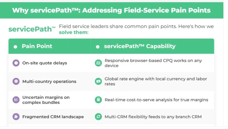 Field-service leaders often share the same pain points: quote delays, complexity, margin uncertainty, and fragmented systems. The table below summarizes how servicePath™’s capabilities map to these challenges: