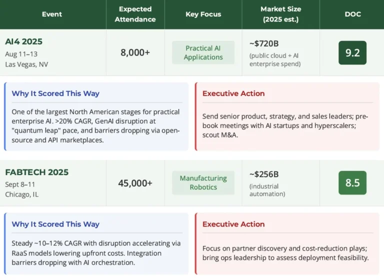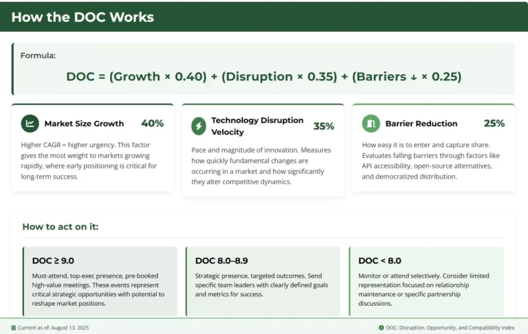 A: The Disruption & Opportunity Coefficient (DOC) is our proprietary 1-10 scoring system that combines market size growth, technology disruption velocity, and barrier reduction to help executives prioritize which events deserve their immediate attention. A DOC of 9+ means “go in strong”—send your top executives, book analyst briefings, and scout M&A opportunities. Scores of 7-8 warrant focused attendance with defined agendas. Use DOC scores to allocate your team’s time and resources to the markets moving fastest with the biggest upside potential.