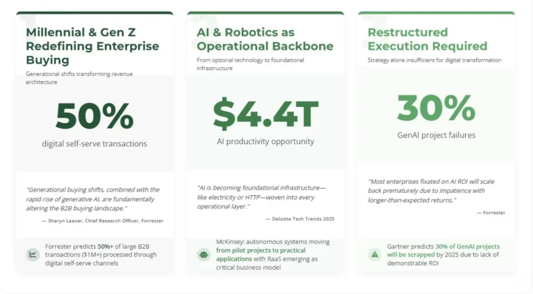 The convergence of generational buying shifts, AI proliferation, and robotics maturation creates an unprecedented commercial acceleration challenge. Executive teams must simultaneously modernize their go-to-market infrastructure while capturing emerging technology opportunities—all within compressed time windows that competitors are equally targeting.