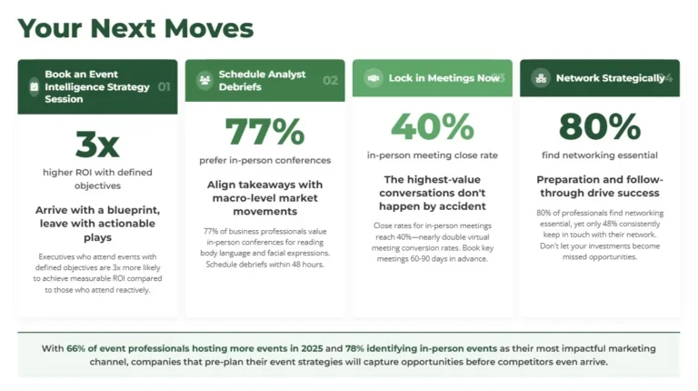 With 66% of event professionals hosting more events in 2025 and 78% of organizers identifying in-person events as their most impactful marketing channel, competition for executive attention has never been higher. The companies that pre-plan their event strategies will capture opportunities before competitors even arrive.