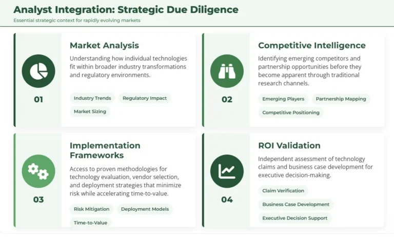 - Implementation Frameworks: Access to proven methodologies for technology evaluation, vendor selection, and deployment strategies that minimize risk while accelerating time-to-value.