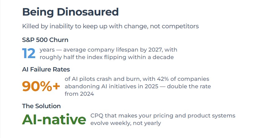 The average S&P 500 company will live just 12 years by 2027—down from 33 years in the 1960s. Half the current index will vanish within the next decade. But here’s what most boards miss: this isn’t about disruption from some scrappy startup. It’s about something far more insidious—companies becoming dinosaured. Going extinct not because competitors beat them, but because they never built organizational renewal into their DNA through AI-native CPQ and continuous adaptation systems. Those AI pilots failing across 90% of enterprises? The technology works. The organizational renewal systems designed to learn and adapt? They don’t exist.