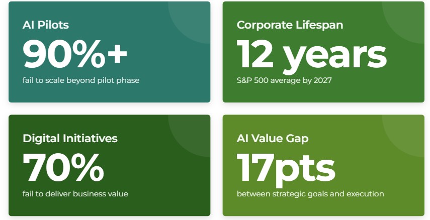 The data is clear. The patterns are established. The solutions exist. 70% of digital transformations fail. Over 90% of AI pilots crash. 95% of professionals say agility is critical, yet most can’t operationalize it. The window is closing.