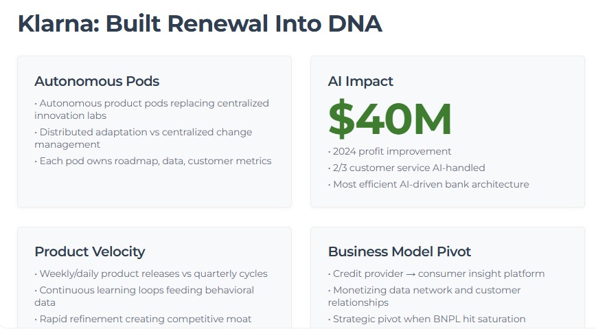 The lesson: Klarna shows you what happens when you wire renewal into your operating model from the beginning—AI handling roughly two-thirds of service chats and contributing an estimated ~$40M to 2024 profit, but the real story is autonomous pods, continuous releases, and renewal as the default state rather than the exception.