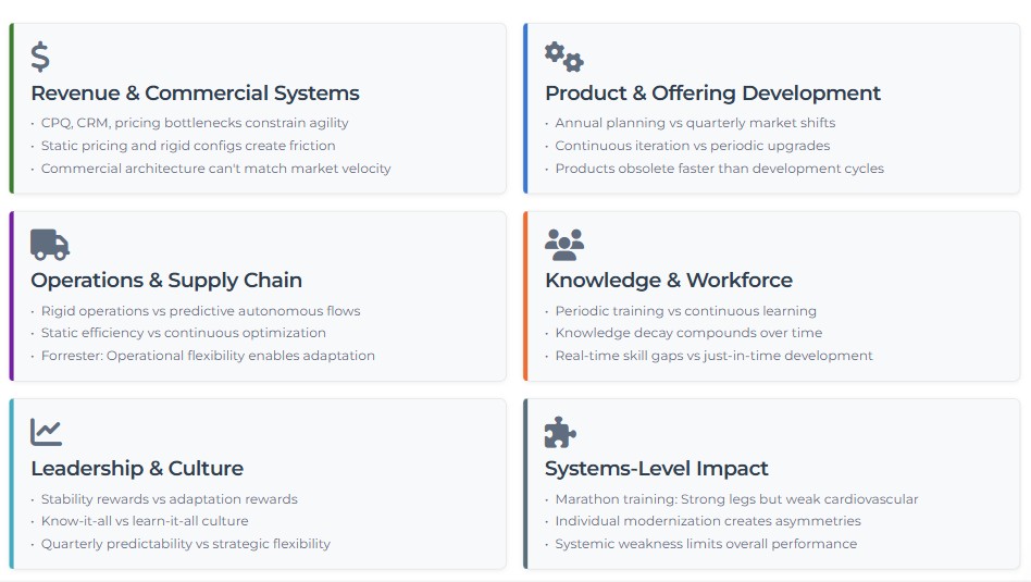 Revenue engines—including CPQ, CRM, pricing, and billing systems—are often the first casualties of organizational fossilization. When these systems can’t adapt rapidly to new products, pricing models, or customer requirements, they become bottlenecks that constrain enterprise agility regardless of innovation happening elsewhere.