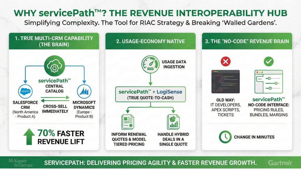 The Solution: You don’t need a 2-year ERP migration. Rather, you need a Revenue Interoperability Hub (like servicePath™) that acts as the “Brain” managing complex logic, while your various CRMs act as the “Body.”