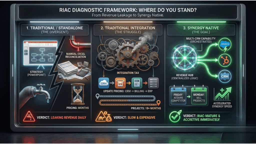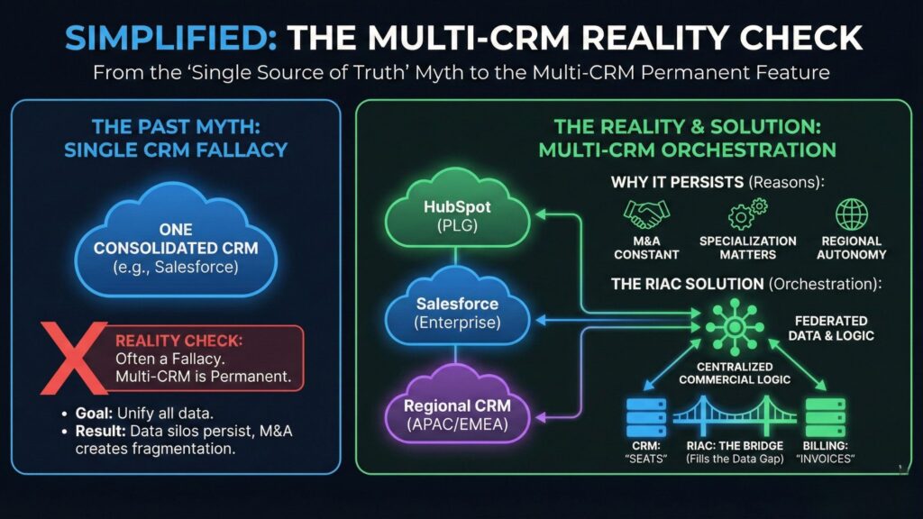 The Concept: Revenue-IT Architecture Convergence (RIAC) is a new strategic framework. Specifically, it moves away from “Old School” consolidation (forcing every acquired unit onto one monolithic Salesforce instance). Instead, it pivots to “New School” orchestration (using a Multi-CRM Revenue Hub to unify commercial logic while letting IT systems remain diverse).