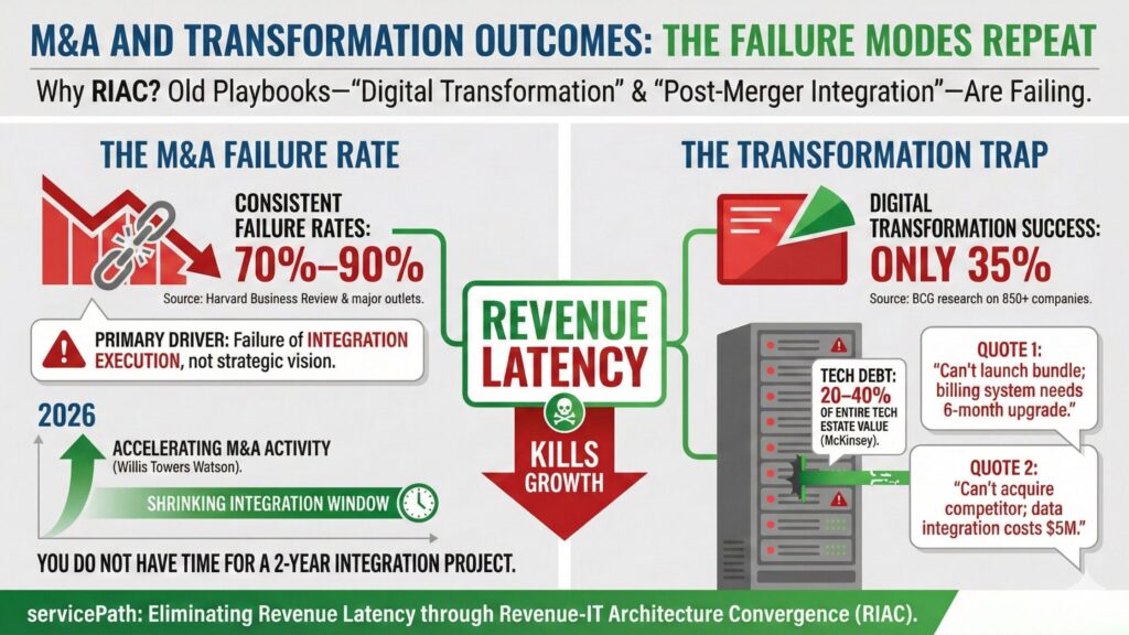 Why do we need a new acronym? Why Revenue-IT Architecture Convergence (RIAC)? Fundamentally, because the old playbooks—”Digital Transformation” and “Post-Merger Integration”—are failing at an alarming rate.