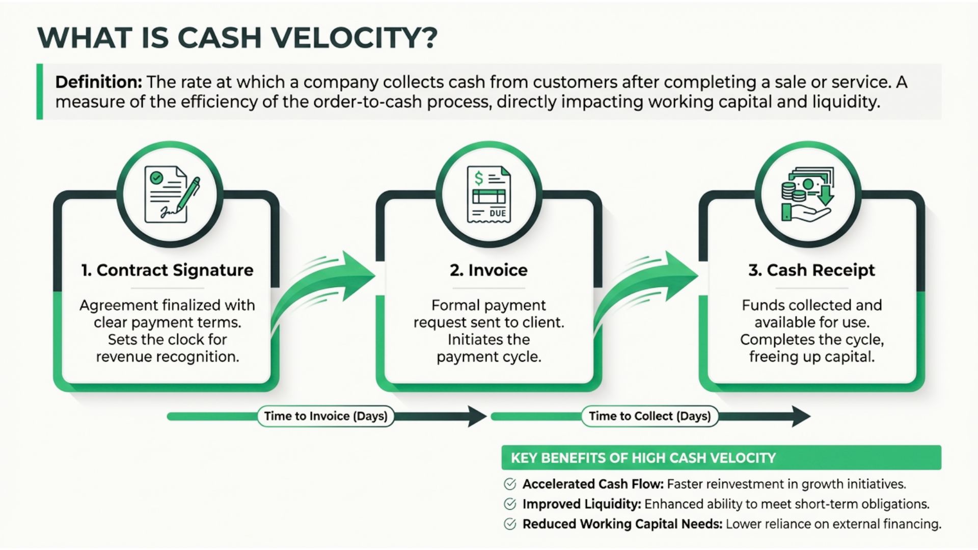 - Cash velocity = speed from contract signature → invoice → cash receipt