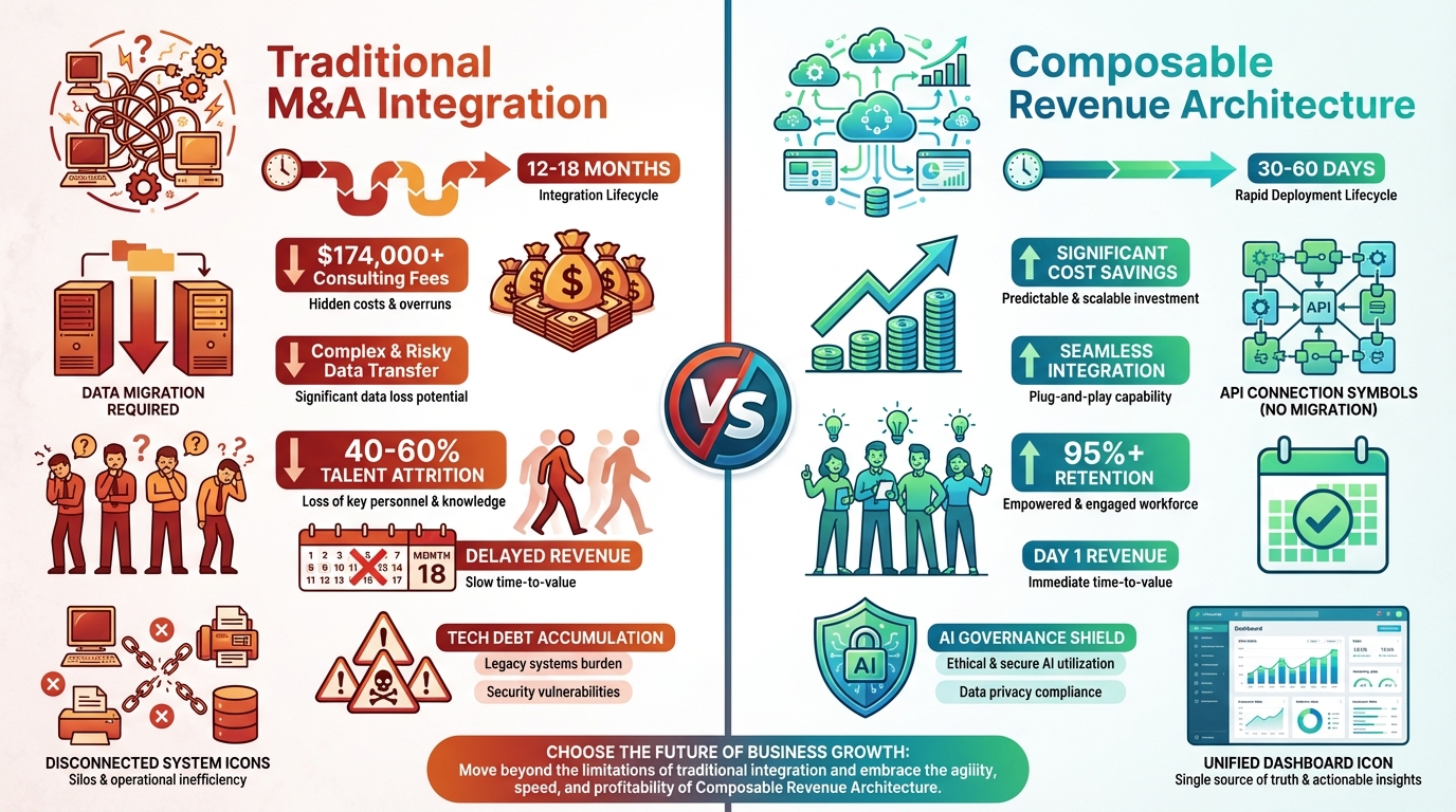 The New Pattern: Elite acquirers are adopting a Composable Revenue Architecture—decoupling revenue logic from CRM systems to enable Day 1 cross-selling without data migrations. Consequently, by deploying a Multi-CRM CPQ layer, companies collapse traditional 14–18 month cross-sell cycles to 30–90 days,* eliminate hundreds of thousands in CRM migration consulting fees, and avoid 40–60% talent attrition.