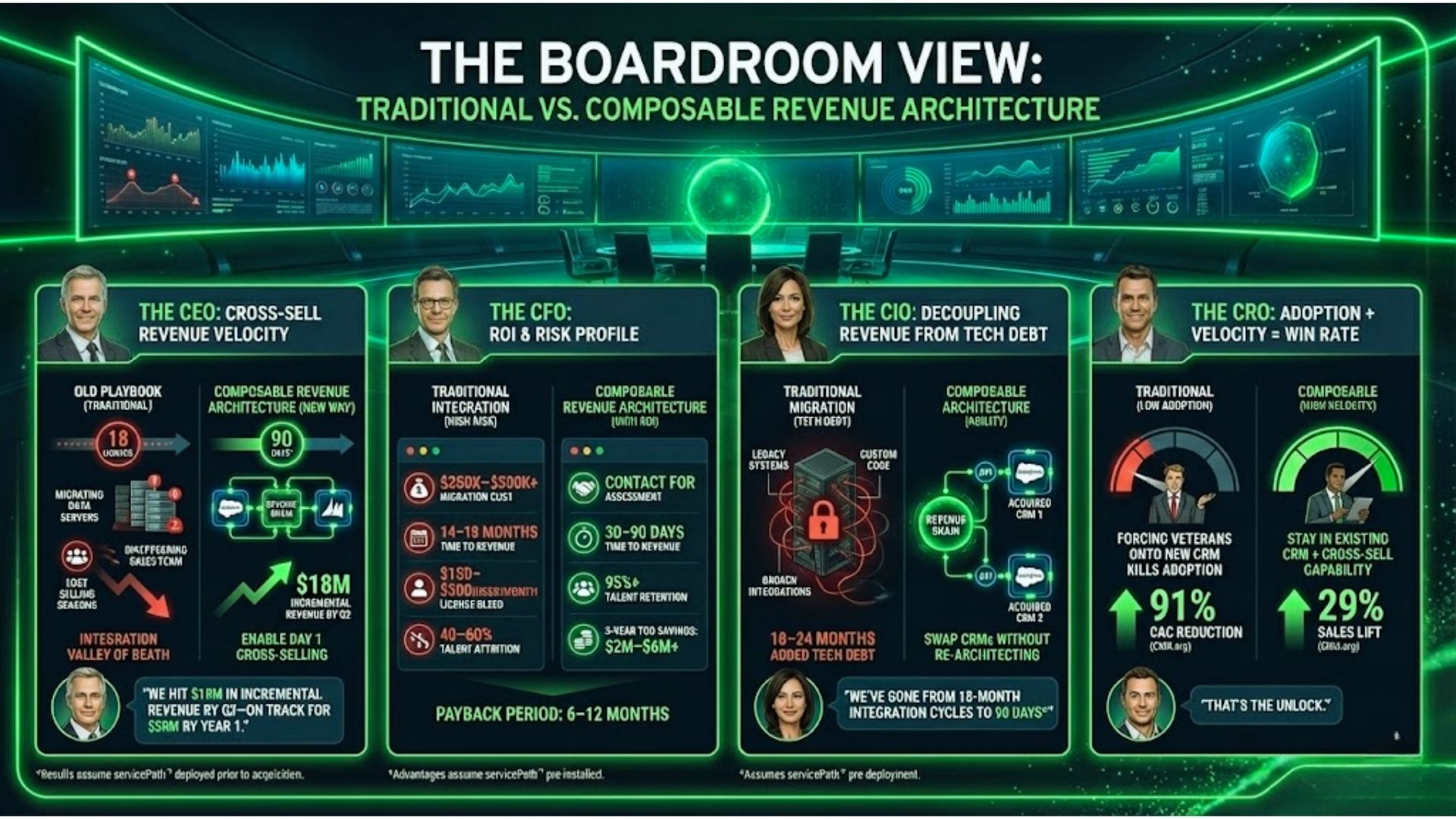 With a Composable Revenue Architecture, we enabled cross-selling within 90 days.* Specifically, their reps stayed in their system, ours in ours, but both could quote the combined catalog. Consequently, we hit $18M in incremental revenue by Q2—on track for $50M by Year 1.”
