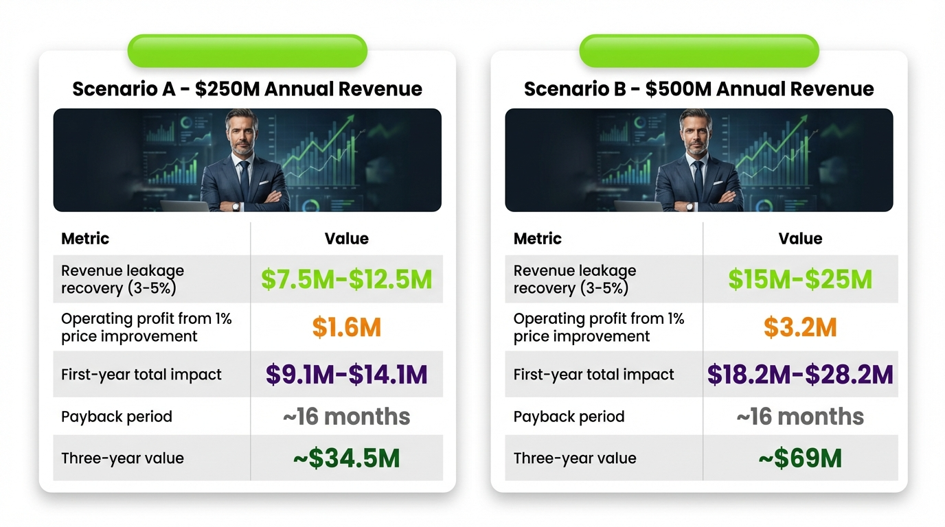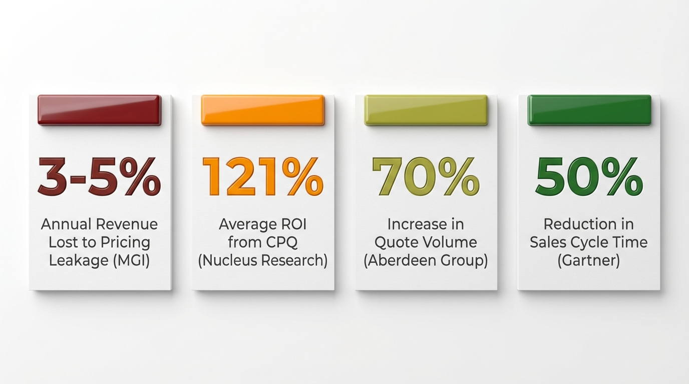 The CFO. MGI Research found the average B2B company loses 3–5% of annual revenue to pricing inconsistency, discount sprawl, and quoting errors. On a $250M base, that’s $7.5M–$12.5M per year. Pair with Nucleus Research’s 121% CPQ ROI and the conversation shifts to “why haven’t we done this already.”
