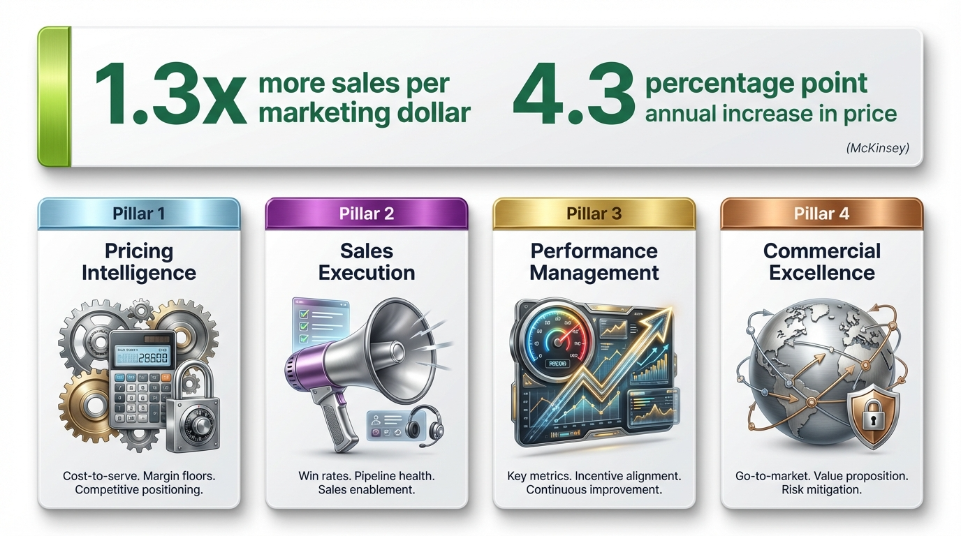 McKinsey found top-quartile companies achieve 1.3x more sales per marketing dollar and a 4.3 percentage point annual increase in price per equivalent unit versus peers. That’s a structural advantage that compounds every year. There are four pillars of commercial excellence.