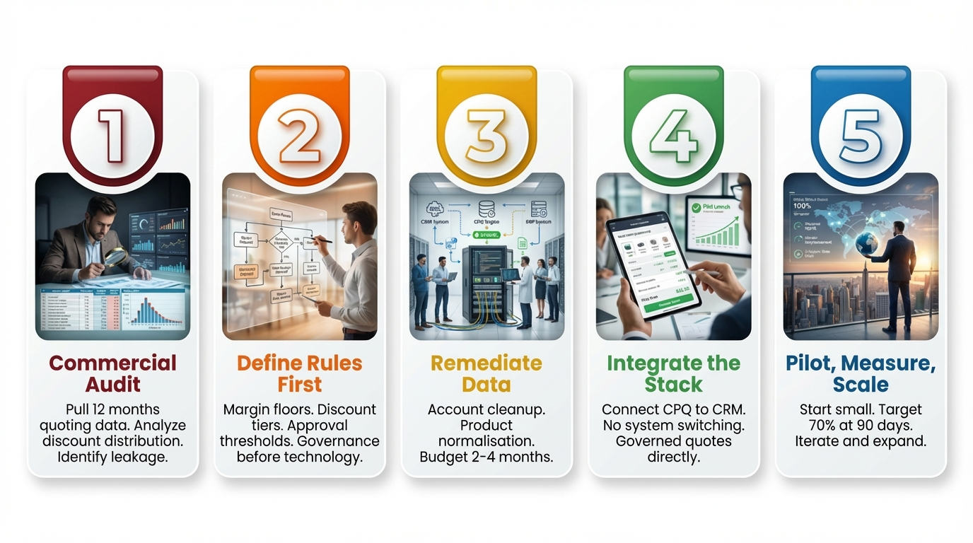 Stage 5: Pilot, Measure, Scale. Start with one cohort. Measure quote time, discount variance, and adoption rate. Iterate. Expand. Target 70% system-generated quotes at 90 days. If you’re below 50%, pause and fix the adoption blockers before scaling. Make the early wins visible. The rest will follow.