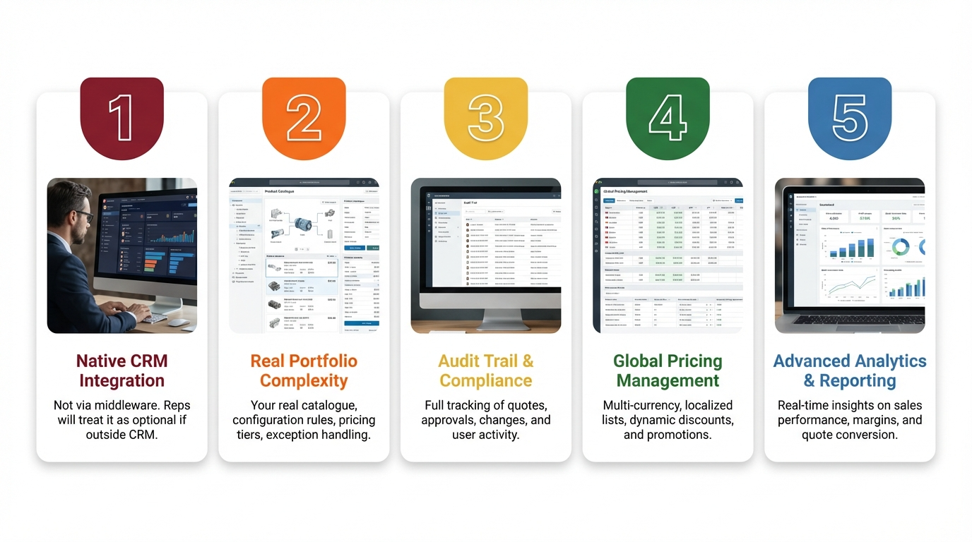 - Does it integrate natively with the CRM you already use? Not via middleware. Native. If CPQ sits outside your CRM, reps will treat it as optional.