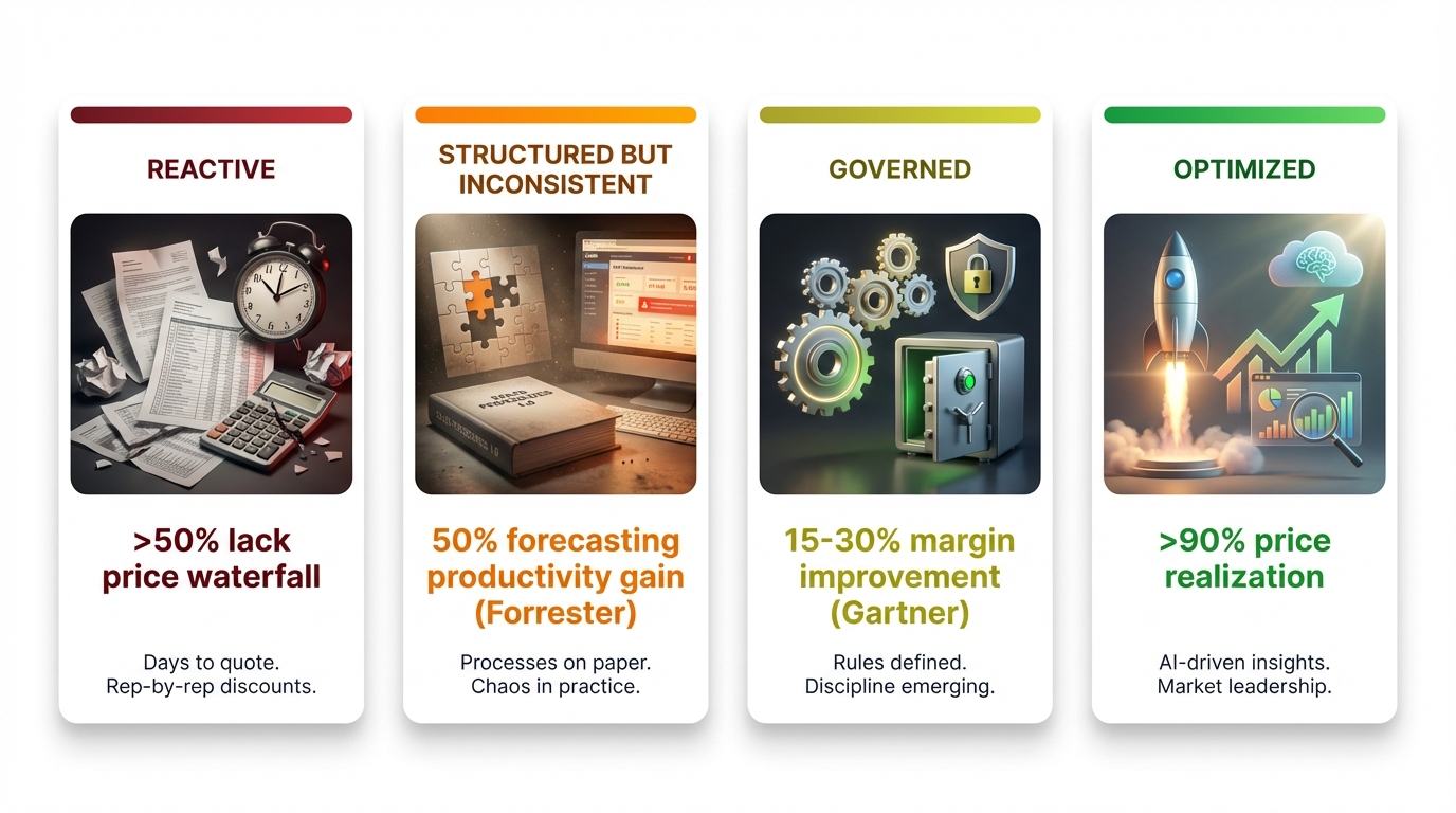 Every deal is a bespoke negotiation. Discounting is a rep-by-rep decision. Quote time is measured in days. Finance finds out what margin looks like when the invoice goes out. More than 50% of mid-market organizations still lack a clear price waterfall, and more than 75% rely on reactive, spreadsheet-based cost-plus pricing rather than optimizing for actual realized pocket price (Pricing Excellence Roadmap 2026). You are not alone here — but you are leaving serious money on the table every quarter.