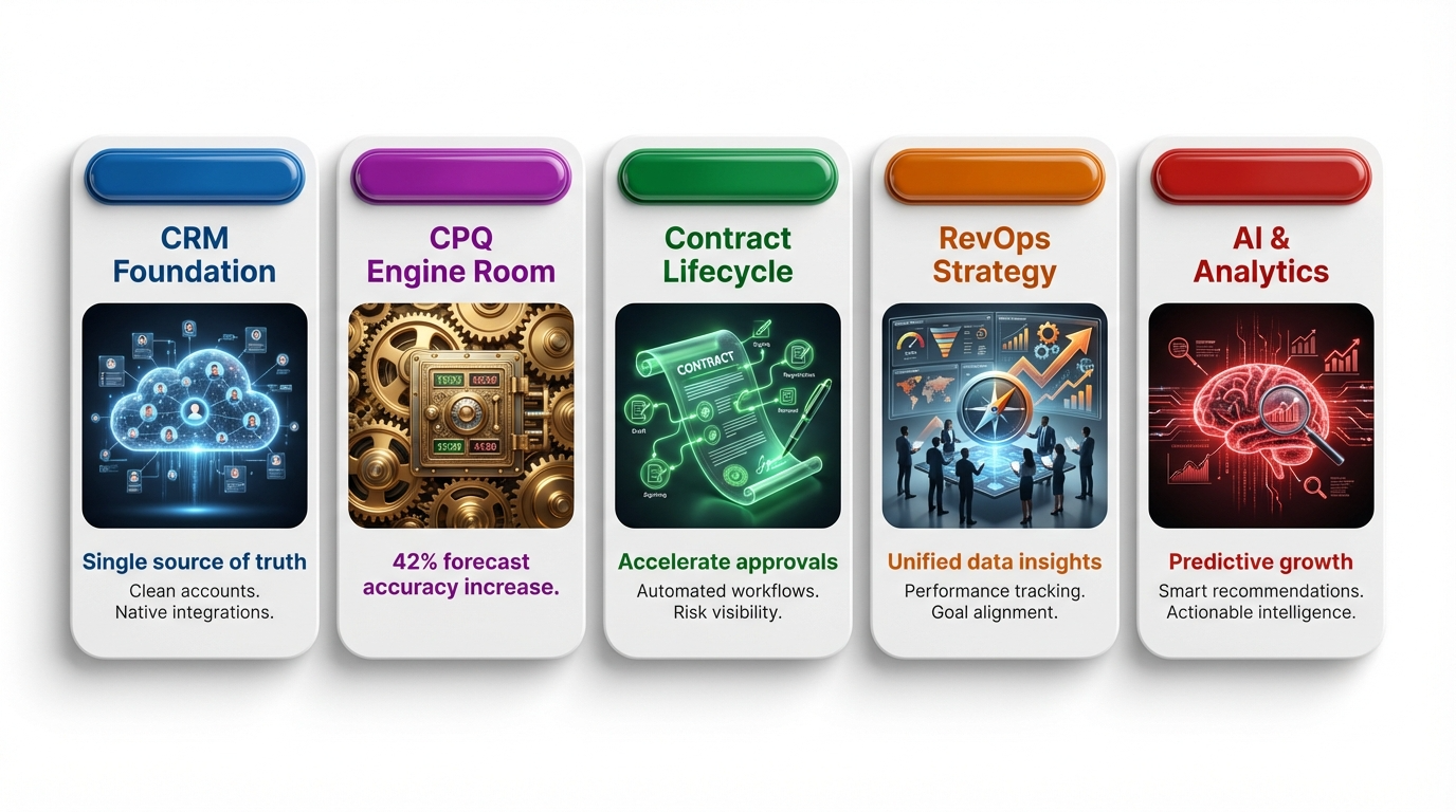 Stage 4: Integrate the Stack. Connect CPQ to your CRM. A rep should be able to generate a governed, margin-conscious quote directly from their CRM opportunity — no system switching, no pricing team email chains. A CPQ sitting outside your CRM is just a more expensive spreadsheet.
