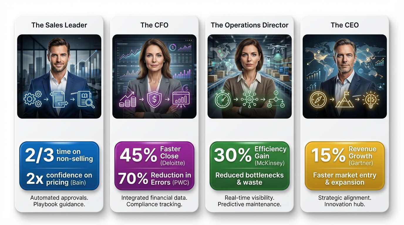 The Sales Leader. McKinsey found non-selling activities consume two-thirds of the average sales team’s time. CPQ gives that time back through automated approvals and embedded playbook guidance. Bain reports reps with dynamic, data-driven guidance are nearly 2x as likely to feel confident on price increases — a leading indicator that correlates with margin attainment when backed by governed data.