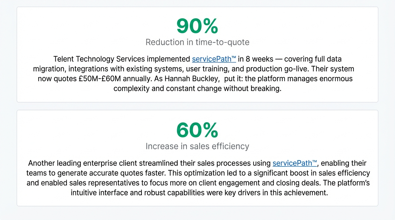 4. Zero-Code Configuration. Business users own the rules. If you need a developer to change a price, you don’t have a platform — you have a software development project. In practice, the vast majority of configurations require zero code. For edge cases involving complex custom logic, servicePath provides guided configuration tools that still keep business users in control.