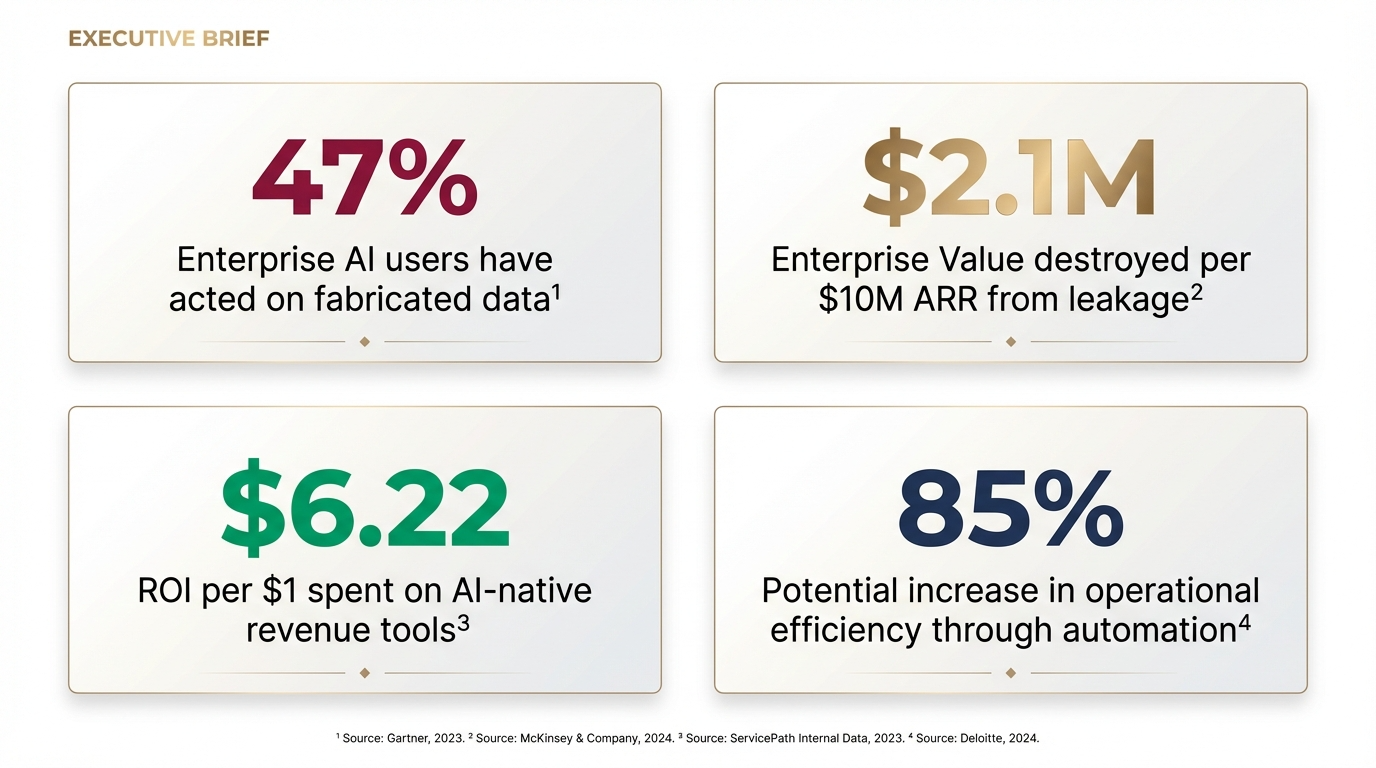 This document outlines a framework for evaluating revenue infrastructure in 2026. Specifically, it explains why ground truth architecture is a forcing function for the industry. It also dissects the hallucination risk nobody prices in. Finally, it presents the financial math that makes AI-native platforms a fiduciary imperative for the CFO.