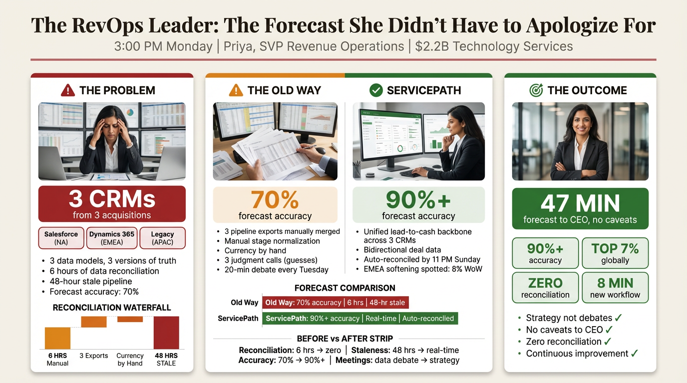 3:00 PM, Monday. Priya, SVP of Revenue Operations, is preparing the Tuesday forecast. She inherited three CRMs from three acquisitions. Salesforce in North America, Dynamics 365 in EMEA, a legacy CRM in Asia-Pacific. Three systems. Three data models. Three versions of the truth.