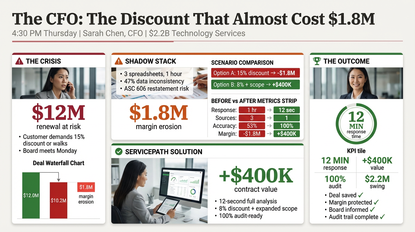 4:30 PM, Thursday. Sarah, CFO of a $2.2B technology services company, gets a call. A $12M renewal is at risk. The customer’s procurement team, backed by an AI negotiation tool, is demanding 15% off or they walk. The board meets Monday.