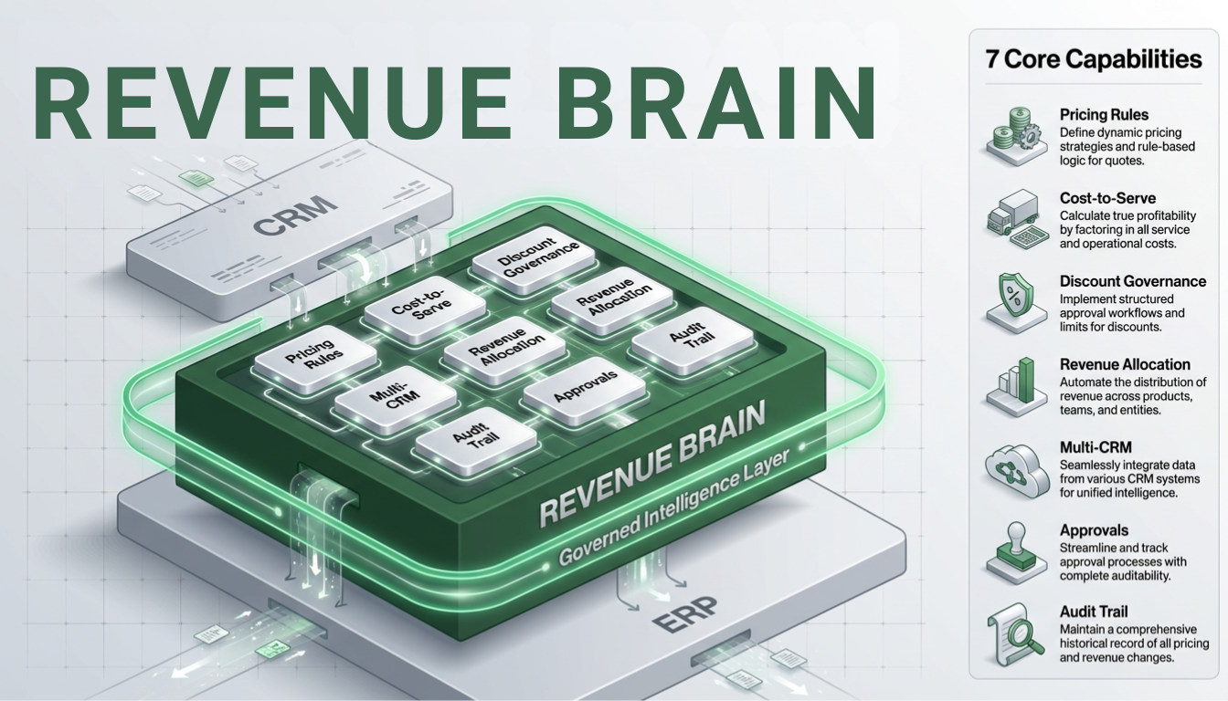 A Revenue Brain is the centralized, governed intelligence layer between CRM and ERP. It ensures every deal is priced correctly, margin-validated, ASC 606-aware, and audit-ready before it reaches the ledger.