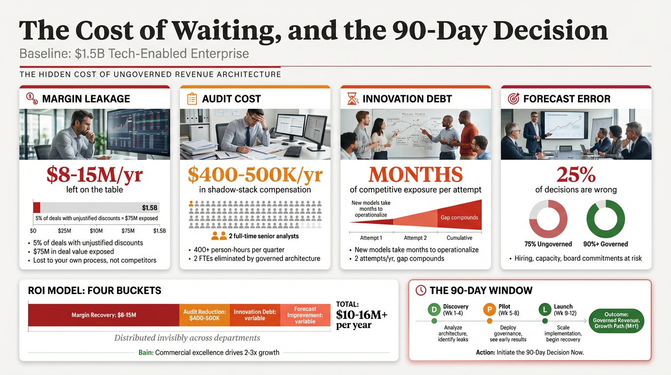 The ROI model we see across deployments breaks into four buckets: margin recovery from eliminating unjustified discounts (typically the largest), audit cost reduction from governed revenue recognition, Innovation Debt elimination from faster monetization model operationalization, and forecast accuracy improvement from clean governed pipeline data.