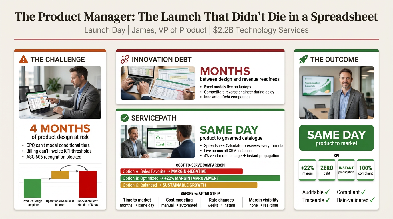 Launch day. James, VP of Product, has spent four months designing an outcome-based bundle that ties fees to customer-achieved KPIs. Uptime targets, adoption thresholds, delivery milestones. The board approved it. Sales is excited. The competitive differentiation is real.