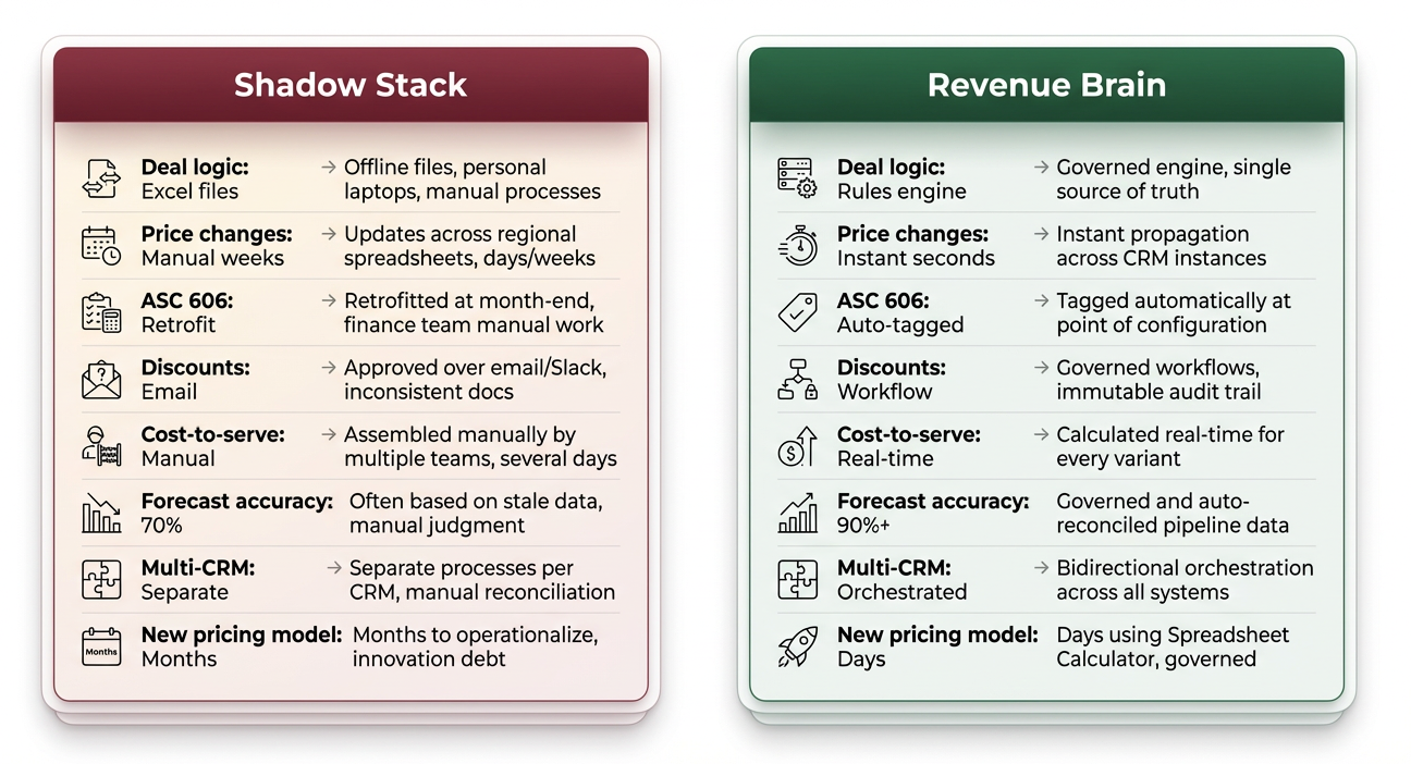 This is the Shadow Stack at full strength. Deal logic lives in offline spreadsheets. Pricing decisions depend on tribal knowledge.